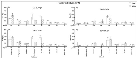 Co-activation index (CoA) of right RF-BF (A), left RF-BF (B), right TA-GM (C), and left TA-GM (D) during walking in water and on land in healthy individuals.