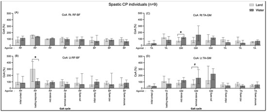 Co-activation index (CoA) of right RF-BF (A), left RF-BF (B), right TA-GM (C), and left TA-GM (D) during walking in water and on land in the CP individuals. * and # are significant median differences between walking on land and in water at p < 0.05 and p < 0.01.