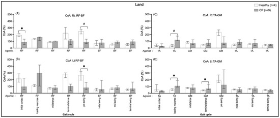 Co-activation index (CoA) of right RF-BF (A), left RF-BF (B), right TA-GM (C), and left TA-GM (D) during walking on land in healthy and CP individuals. * and # are significant median differences between walking on land and in water at p < 0.05 and p < 0.01, respectively.