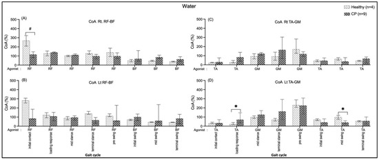 Co-activation index (CoA) of right RF-BF (A), left RF-BF (B), right TA-GM (C), and left TA-GM (D) during walking in water in healthy and CP. * and # are significant median differences between walking on land and in water at p < 0.05 and p < 0.01.