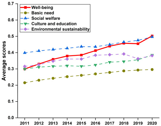 The comprehensive evaluation method was utilized to calculate the well-being scores of 30 provinces from 2011 to 2020. We first present the trends of the average scores of four subsystems and well-being in Figure 1.