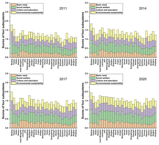 Next, we focus on the discussion about the score of each subsystem. It is presented in Figure 2 using a stacked column chart, where it comprises four columns stacked vertically, namely, the scores of four subsystems, one on another. The summation of four columns generally measures the well-being of each Chinese province. It should be noted that the theoretical maximum of the summation of the scores of the four subsystems is 4.