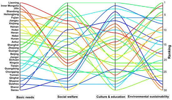 To better show the scores of the four subsystems of each province, a parallel chart was applied to display the advantages and disadvantages of each province when evaluating well-being (Figure 3). Specifically, we re-arranged the scores of each subsystem of 30 provinces into ascending order. The higher the ranking is, the better the subsystem level.