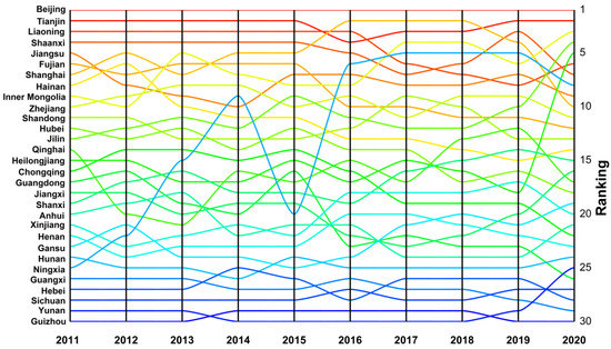 We also applied the entropy weight method to calculate the well-being scores of 30 provinces based on the scores of the four subsystems and then re-arranged the scores of 30 provinces into ascending order. Hence, the changes in rankings of the well-being scores of 30 provinces from 2011 to 2020 can be presented in Figure 4.