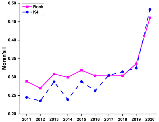 Moran’s I values with Rook and K4 matrices from 2011 to 2020.