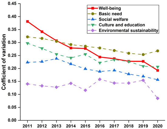 From the above discussions, it is safe to say that there is significant regional variability in the scores of four subsystems and well-being across the 30 provinces. The coefficient of variation (CV), defined as the ratio of standard deviation to mean, is used to measure the dispersion of well-being scores, which can be usually adopted to test if they can converge to a common steady state. Specifically, a larger CV value indicates a wider gap in the well-being scores and vice versa. The CV values of four subsystems and well-being across 30 Chinese provinces from 2011 to 2020 are plotted in Figure 7.