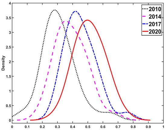Then, kernel density estimations results are given in Figure 8 in order to better explore how the well-being scores of 30 provinces change over time.