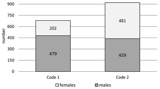 The conducted research shows that EMS teams were more often dispatched to workplaces in the urgency code 2 (57.5%) than in the urgency code 1 (42.5%). The highest percentages of EMS team interventions in men were in code 1 (70.3%), and in women in code 2 of urgency (52.3%). The analysis of EMS team interventions at workplaces shows significant differences (χ2 = 81.9, p < 0.001) depending on the urgency code, considering gender (Figure 1, Table 1).