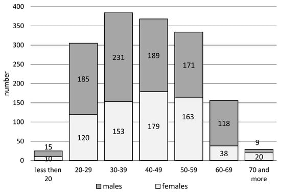 In Poland, the working age is defined by the Central Statistical Office [,] as the age of ability to work, starting at the age of 18 and ending at the age of 60 for women and 65 for men. In 2020, the working age population of Poland accounted for 59.5% (n = 22,771.4), including women 27.9% (n = 10,683.7 thousand) and men 37.6% (n = 12,087.7) [].