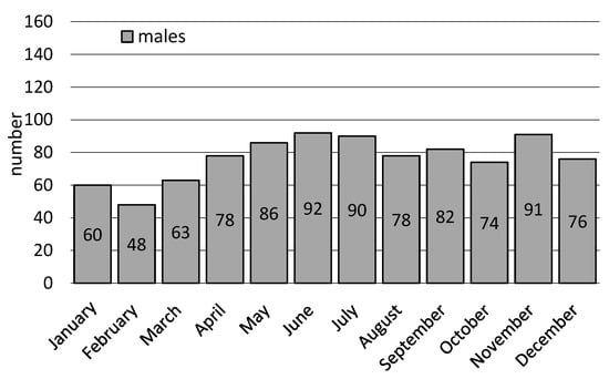 EMS teams most often left for workplaces in autumn (n = 457; 28.5%). In turn, the month of the most frequent interventions was September (n = 156; 9.7%) with (Figure 3), Fridays (n = 303; 18.9%) being the most frequent, and the hourly ranges: 08:01–12:00 (n = 609; 38.0%). EMS teams were called to workplaces least frequently in winter (n = 299; 18.7%), in the month of February (n = 88; 5.5%) (Figure 3), on Sunday (n = 45; 2.8%), during hours: 00:01–04:00 (n = 52; 3.3%) and 20:01–24:00. In the case of interventions for women, they most often took place in autumn (n = 210; 30.8%), September (n = 74; 10.8%) and October (n = 72; 10.5%) (Figure 3), on Fridays (n = 141; 20.6%) and Tuesdays (n = 134; 19.6%), during 08:01–12:00 (n = 268; 39.2%), and least frequently in winter (n = 137; 20.1%), February (n = 40; 5.9%) and July (n = 44; 6.44), respectively %) (Figure 3), Sunday (n = 19; 2.8%), during 00:01–04:00 (n = 18; 2.6%). In turn, EMS team interventions in men’s workplaces were most common in the summer (n = 261; 28.4%), in June (n = 92; 10.0%) (Figure 3), on Monday (n = 179; 19.5%), during hours: 08:01–12:00 (n = 341; 37.2 %). The least frequent interventions were in winter (n = 162; 17.7%), February (n = 48; 5.2%) (Figure 3), and Sunday (n = 26; 2.8%) during 00:01–04:00 (n = 34; 3.7%).