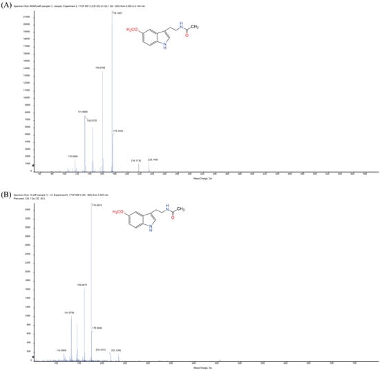 - Carter, M.D.; Calcutt, M.W.; Malow, B.A.; Rose, K.L.; Hachey, D.L. Quantitation of melatonin and n-acetylserotonin in human plasma by nanoflow LC-MS/MS and electrospray LC-MS/MS. J. Mass Spectrom. 2012, 47, 277–285. [Google Scholar] [CrossRef]