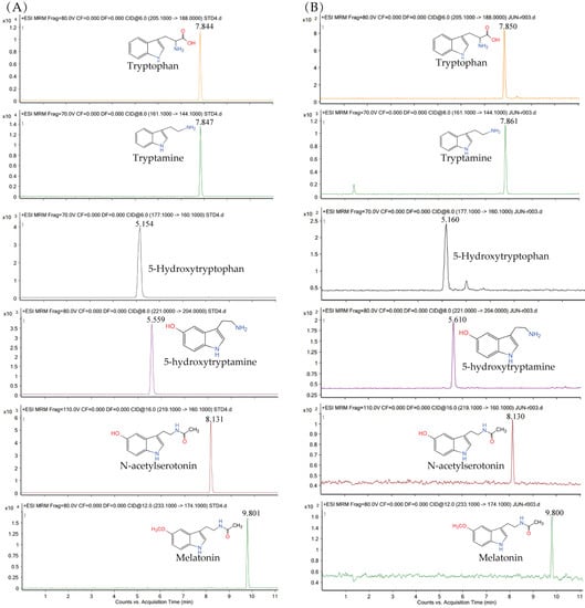 To further investigate MT synthetic pathway in Xoo, the synthetic intermediates were extracted after 24 h of incubation and analyzed by LC-MS. When using standard compounds, the retention times for tryptophan, tryptamine, 5-hydroxytryptan, 5-hydroxytryptamine, N-acetylserotonin and MT were 7.844, 7.847, 5.154, 5.559, 8.131 and 9.801 min, respectively. In agreement, the compounds were detected in Xoo extracts at 7.850, 7.861, 5.160, 5.610, 8.130 and 9.800 min (Figure 2), respectively. The content of tryptophan, tryptamine, 5-hydroxytryptan, 5-hydroxytryptamine, N-acetylserotonin and MT in Xoo cells was 486 ± 2.6, 639 ± 2.3, 248 ± 1.9, 265 ± 1.1, 63 ± 1.5 and 66 ± 2.3 ng/mL, respectively (Figure S1).