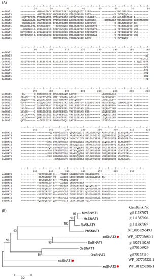 In order to predict the function, theoretical pI (isoelectric point), MW (molecular weight) and subcellular location were calculated. The amino acid sequence of xoSNAT3 was blasted in Uniprot (https://www.uniprot.org/ (accessed on 8 October 2022)) and pfam (http://pfam.xfam.org/ (accessed on 8 October 2022)) databases to determine xoSNAT3 function. Parameters of Uniprot were as follows: sequence type-“protein.” program-“blastp,” E-threshold-“10,” Matrix-“Auto Blosum62,” Filter-“None,” Gapped-“Yes,” Hits-“250,” and HSPs per hit-“All.” The pfam analysis did not require parameter settings. Expasy (https://web.expasy.org/compute_pi/ (accessed on 8 October 2022)) was used to predict its theoretical pI and MW, and PSORT II (http://psort.hgc.jp/form2.html (accessed on 8 October 2022)) used to predict xoSNAT3 subcellular location. These last software did not require any parameter settings.