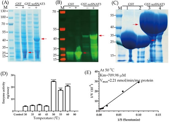 The full length of xoSNAT3 contained 501 bp, thus encoding a protein with 166 amino acids. Protein molecular weight of xoSNAT3 and GST is 17.95 and 26 KDa, respectively. It was predicted that xoSNAT3 contained an acetyltransferase (GNAT) domain by Pfam and Uniprot database scanning. To confirm xoSNAT3 activity, its frame was fused into pGEX-6P-1 vector with N-terminal glutathione-S-transferase-tagging. After 12–16 h post IPTG induction, the purified SNAT3-GST fusion proteins were analyzed by SDS-PAGE and western blot, and its enzymatic activity and kinetic parameters were analyzed in vitro. As shown in Figure 4, GST-xoSNAT3 (43.95 KDa) and GST (26 KDa) proteins were successfully induced by IPTG, and further confirmed by western blotting (Figure 4A–C). The optima enzymatic activity of GST-xoSNAT3 was detected at 50 °C (Figure 4D). The values for Km and Vmax using serotonin as the subtrate were 709.98 μM and 2.21 nmol/min/mg protein, respectively (Figure 4E).