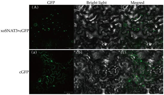 Localization of xoSNAT3 in tobacco cells. (A,a) Fluorescent images of xoSNAT3-GFP and GFP. (B,b) Bright Light filed of xoSNAT3-GFP and GFP. (C,c) Migration images of xoSNAT3-GFP and GFP. Recombinant plasmid with EHA105 was injected into 3-week-old tobacco leaves, and the GFP signal was observed by confocal imaging.