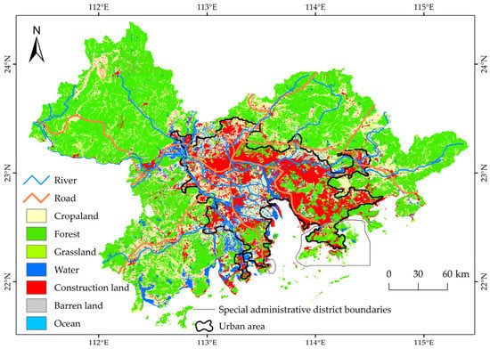 Study area in the Guangdong–Hong Kong–Macao Greater Bay Area. The land cover data were taken from [].