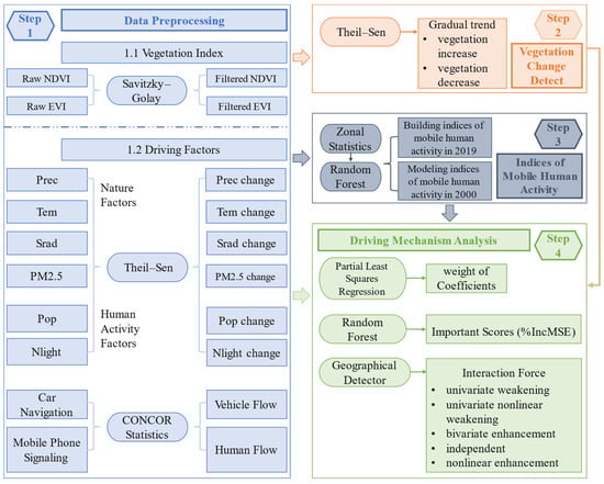 The framework of the vegetation change and its driving factors includes four parts: data preprocessing, vegetation change detection, indices of mobile human activity construction, and driving mechanism analysis of vegetation change (Figure 2). The data preprocessing includes obtaining the vegetation index with the influence of clouds and noise removed, which was processed using Savitzky–Golay filtering, acquiring factor change data using a Theil–Sen trend analysis (e.g., Prec, Temp, and Srad, etc.), and obtain flow frequency data through CONCOR method for car navigation and mobile phone signaling data. The second part of vegetation change detection is disposed of in the S-G filtered vegetation index by Theil–Sen trend analysis. The third part of building and modeling the indices of mobile human activity in 2019 and 2000, respectively. The fourth part of the driving mechanism analysis of vegetation change used PLSR analysis, RF regression analysis, and the GD factor interaction detection method. The following subsections provide further details on each method.