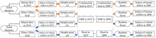 We first converted the vehicle flow data in 2019 to the grid of 250 m × 250 m. Then, we statistic the human inflow and human outflow, respectively. Because vehicle flow was related to GDP and road networks [], therefore, we used the GDP and road networks in 2000 as a regressor (Table 2), using RF regression to fit the relationship between human inflow and outflow with the regressor, respectively. The accuracy of the fitted model was verified by statistical parameters (Table S1, Supplementary Materials). Based on the fitted model, we then simulated the vehicle inflow and vehicle outflow in 2000, respectively. The details of the processing are presented in Figure 3.