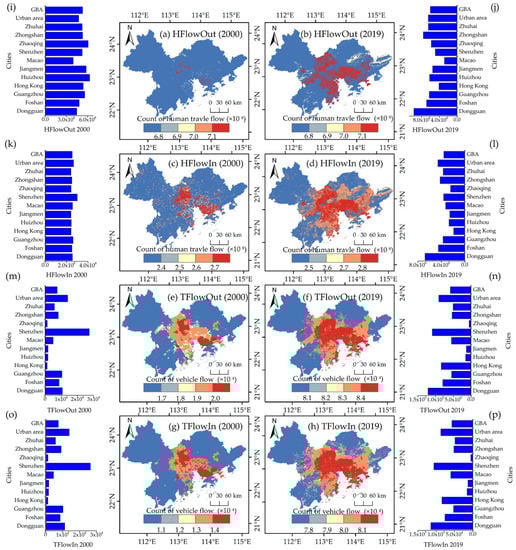 Spatial change trend for the indices of mobile human activity from 2000 to 2019. (a,b) depicted the indices of human travel outflow in 2000 and 2019, respectively. (c,d) depicted the indices of human travel inflow in 2000 and 2019, respectively. (e,f) depicted the indices of vehicle outflow in 2000 and 2019, respectively. (g,h) depicted the indices of vehicle inflow in 2000 and 2019, respectively. The bar graph from (i–p) on the left and right were the statistical result of the indices of mobile human activity.