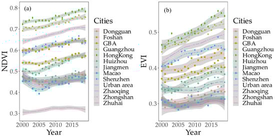 MODIS vegetation index of time-series NDVI and EVI products (MOD13Q1 Version 6, National Aeronautics and Space Administration, SD, USA) data were collected from 2000 to 2019 with 16-day composite products at 250 m resolution. We obtained data from the NASA Land Processes Distributed Active Archive Centre (LPDAAC). Because vegetation in the GBA is dominated by evergreen vegetation, the annual period was selected for January to December as the vegetation growing season, referring to research on vegetation phenology []. We used the mean synthesis method to process the annual NDVI and EVI images, and the data were projected to WGS84/Albers Equal Area Conic. Additionally, to reduce disturbances caused by cloud, shade, and atmospheric radiation, NDVI and EVI data were smoothed using the Savitzky–Golay filter in the TIMESAT tool in MATLAB [].