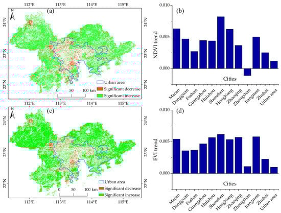 From 2000 to 2019, the vegetation index in the GBA showed a steadily increasing trend. The annual average increases in the NDVI and EVI were 0.0024 (p < 0.05) and 0.0023 (p < 0.01), respectively. In general, Hong Kong, Shenzhen, Guangzhou, and Foshan were the five cities with relatively significant increases in the vegetation index, showing values higher than the annual average level in the GBA. NDVI data showed that Huizhou (0.0053, p < 0.01) and Shenzhen (0.0038, p < 0.01) had the fastest vegetation growth, whereas EVI data showed that Hong Kong (0.0045, p < 0.01) and Huizhou (0.0035, p < 0.01) had the fastest vegetation growth (Figure 5).