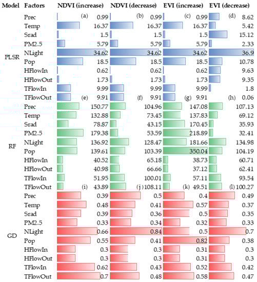 Figure 7 shows that the importance score of climatic factors in relation to vegetation change is high, whereas the contribution of human activity factors is relatively low according to the %IncMSE values of the RF regression models. Based on both the NDVI and EVI, the human activity factors of NLight were shown to have a significant impact on vegetation decrease, with %IncMSE values of 139.81 (Figure 7f,h). In addition, the impact of human and vehicle flow on vegetation decrease was shown to be significant, with the TFlowIn with %IncMSE values of 108.11. For vegetation increase, it was shown to be greatly affected by climatic factors of PM2.5, Prec, and Temp, with the %IncMSE values being 218.89, 166.40, and 145.56, respectively (Figure 7e); Pop was also found to play an important role in the increase in vegetation changes (Figure 7f).