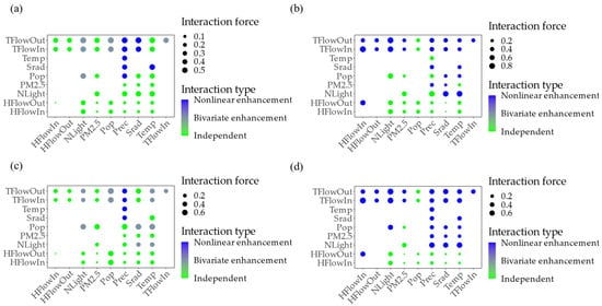 Based on the GD methods, the main interactions between factors include bivariate enhancement and independent and nonlinear enhancement in the GBA. Natural factors, such as PM2.5 and Temp, tend to have independent influences on vegetation change (green scatter in Figure 8), whereas mobile human activity factors mainly exhibit nonlinear enhancement effects. In addition, the nonlinear interaction of human flow (HFlowIn and HFlowOut) and vehicle flow (TFlowIn and TFlowOut) was found to enhance the trend of vegetation decrease (blue scatter in Figure 8b,d), with a maximum interaction force of 0.82 between HFlowIn and TFlowIn. In contrast, the nonlinear interaction between Prec and other factors enhanced the change in vegetation (blue scatter in Figure 8a,c). The highest interaction force of 0.63 was between Prec and Pop.