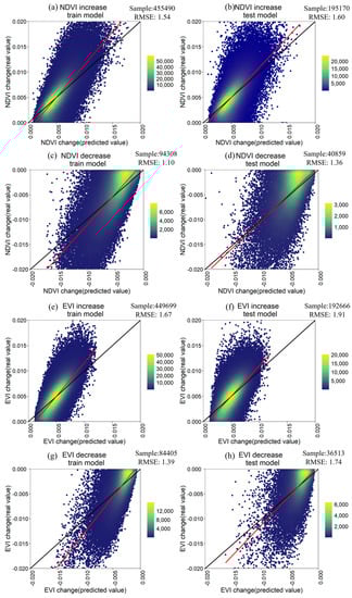 Accuracy assessment of Random Forest regression. (a,b) the accuracy of random forest in NDVI increases based on the train and test models, respectively. (c,d) accuracy of rando forest in NDVI decreased based on the train and test model, respectively. (e,f) accuracy of rando forest in EVI increase based on the train and test model, respectively. (g,h) accuracy of rando forest in EVI decreased based on the train and test models, respectively.