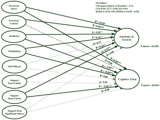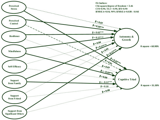 The cognitive triad factor was significantly predicted by resilience (β = −0.29, p = 0.006), perceived stress (β = 0.36, p < 0.001), mindfulness (β = −0.20, p < 0.001), and support from friends (β = −0.40, p < 0.001). All independent variables explained 65.90% and 69.90% of variance on the autonomy and growth, and the cognitive triad, respectively.