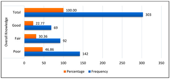 The 46.86% (CI: 41.24–52.48%) of the surveyed early postpartum women had poor knowledge about oral health prevention in infants aged 0 to 2 years old, while 30.36% (CI: 25.18–35.54%) and 22.77% (CI: 18.05–27.49%) showed fair and good knowledge, respectively (Figure 1).
