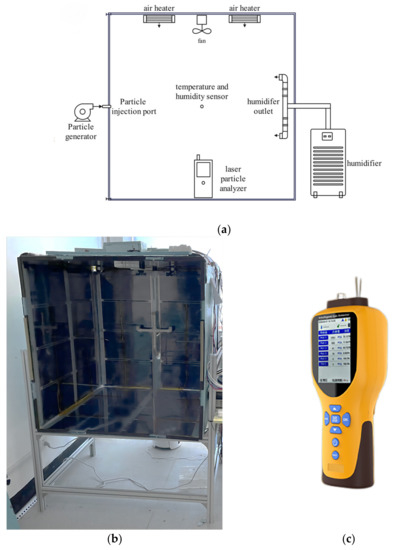 2) were embedded between the two layers, and two air heaters (each with a power of 1000 W) were installed on the chamber ceiling. An ultrasonic humidifier (adjustable humidification capacity of 1500 mL/h) was connected through the back wall of the chamber to regulate the internal relative humidity. Two axial fans (power 35 W, speed 50 rpm/s) were installed on the chamber ceiling to quickly make the internal particles and ambient parameters even. The front wall of the chamber could be opened with a particle injection port at the center. All the joints, valves, and openings of the chamber were sealed for airtightness during the experiment. After commissioning, the temperature and humidity in the experimental chamber could be uniformly controlled in the range of 20~70 °C (≤±1 °C), RH = 20~70% (≤±3%).