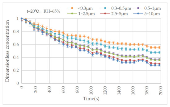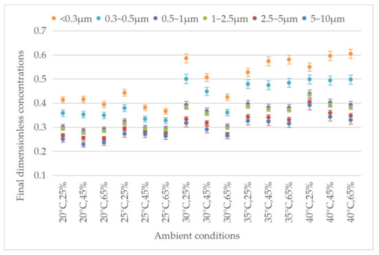 Figure 4. Among all the ambient conditions and all the diameter ranges, the final concentrations decreased significantly compared to the initial concentrations. For the same ambient condition, the reduction in the particle concentrations was positively correlated with the particle diameters. Under different conditions, the final dimensionless concentrations of the particles with diameters below 0.3 μm were between 0.36 and 0.60, while the final dimensionless concentrations of those measuring 5~10 μm were only 0.23~0.39. The reason for this is that, for a single particle, the deposition velocity increases with the particle mass under the influence of gravity and inertia. Many studies have also shown that particle size has a significant influence on deposition, which is consistent with the results obtained in this study [
