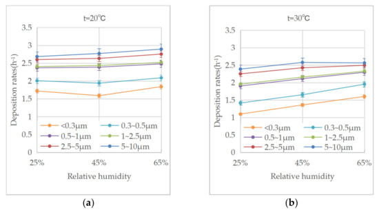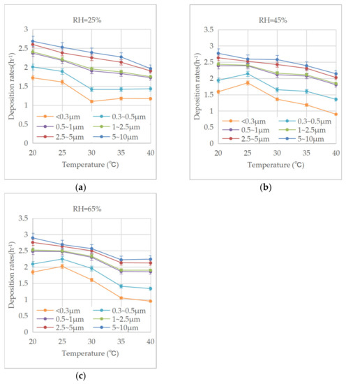 Figure 6, with the same relative humidity, the deposition rates of the different particle diameters tended to decrease with the increase in temperature. However, the deposition rates of the particles with diameters below 0.5 μm varied greatly with the temperature. Specifically, with the rising temperature and the constant relative humidity of 25%, the deposition rates of the particles below 0.5 μm decreased first and then increased slightly, with the minimum values occurring at 30 °C; for the relative humidity of 45% and 65%, the deposition rates below 0.5 μm increased first and then decreased with temperature, with the maximum value occurring at 25 °C. These characteristics indicate that the deposition rates of the biomass particles were mostly higher at lower temperatures. For the particles with diameters larger than 0.5 μm, the deposition rates were greatly influenced by gravity and inertia. When the temperature rises, the density of air decreases, and the dynamic viscosity of air increases. According to Stokes’ law of deposition [
