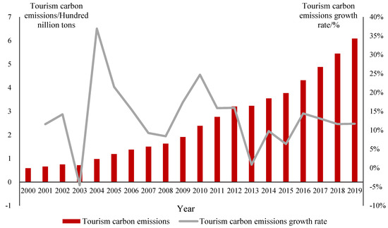 Tourism is not only a booster for national economic development but also an important carrier for implementing the development goals of Transforming our World: The 2030 Agenda for Sustainable Development issued by the United Nations. According to The World Tourism Economic Trend Report 2022, China’s total tourism revenue has historically ranked second in the world and ranks first among developing countries from 2019 to 2021. As a growth point of national economic development, tourism makes an important contribution to the improvement of the national economic level [1]. However, the continuous expansion of the tourism industry, tourism flow, tourist consumption behavior, and tourism product production processes will result in increased energy consumption, releasing carbon dioxide and other greenhouse gases that will have a negative impact on the environment [2,3]. In the China Energy Statistical Yearbook 2020, the total energy consumption of tourism-related transportation, warehousing and postal services, wholesale and retail trade, accommodation, and catering industries totaled 570 million tons of standard coal, accounting for 11.8% of the total annual energy consumption in 2019. According to the report released by the World Tourism Organization, carbon emissions from international tourism accounted for 8% of global greenhouse gas emissions in 2019, and carbon emissions from global tourism transportation are expected to increase to 1.998 billion tons in 2030, which makes up 5.3% of global carbon emissions.