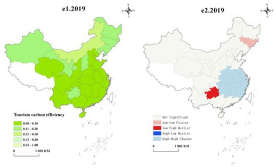 According to the measurement results, the tourism carbon emission efficiency value in China was lower than 1 from 2000 to 2019. We divide the tourism carbon emission efficiency of 30 provincial regions into the lowest level (0.4~1.00), lower level (0.30~0.40), middle level (0.20~0.30), higher level (0.10~0.20), and highest level (0~0.10). To further identify the High-High (the regions with low tourism carbon emission efficiency values are surrounded by the regions with low tourism carbon emission efficiency values) clusters, Low-Low (the regions with high tourism carbon emission efficiency values are surrounded by the regions with high tourism carbon emission efficiency values) clusters, Low-High (the regions with high tourism carbon emission efficiency values are surrounded by the regions with low tourism carbon emission efficiency values) clusters, and High-Low (the regions with low tourism carbon emission efficiency values are surrounded by the regions with high tourism carbon emission efficiency values) cluster characteristics of the tourism carbon emission efficiency, we conducted a local spatial autocorrelation analysis.