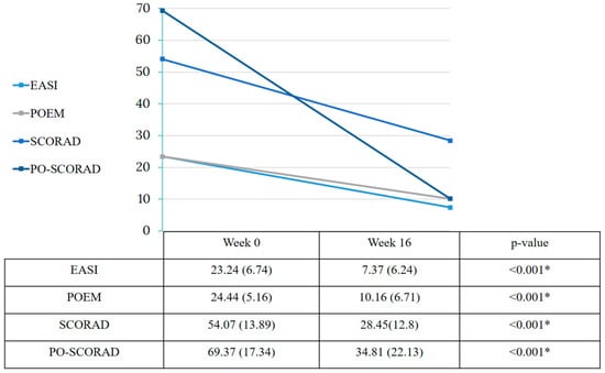 - Cork, M.; Eckert, L.; Simpson, E.L.; Armstrong, A.; Barbarot, S.; Puig, L.; Girolomoni, G.; De Bruin-Weller, M.; Wollenberg, A.; Kataoka, Y.; et al. Dupilumab improves patient-reported symptoms of atopic dermatitis, symptoms of anxiety and depression, and health-related quality of life in moderate-to-severe atopic dermatitis: Analysis of pooled data from the randomized trials SOLO 1 and SOLO 2. J. Dermatol. Treat. 2019, 31, 606–614. [Google Scholar] [CrossRef] [PubMed]