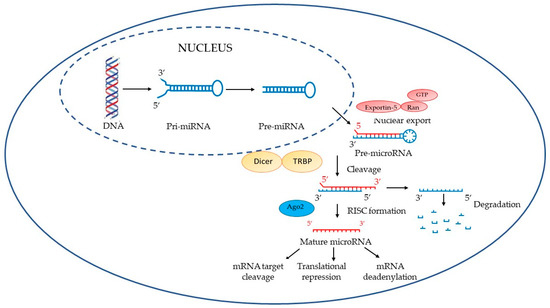 MiRNAs are single-stranded non-coding RNAs, which play important roles in a variety of cell processes (e.g., cell development and growth, differentiation and apoptosis) [25]. Their role in gene regulation was first identified in Caenorhabditis elegans in the early 1990s, where the miRNA (LIN 4) negatively regulated the gene LIN14. Afterwards, they were identified to play a major role in the post-transcriptional regulation of human genes [26]. MiRNAs are usually made of 18–25 nucleotides, are extremely specific in tissues and are highly preserved. MiRNAs, binding complementary messenger RNA (mRNA) sequences in the 3′UTR, inhibit their translation, regulating several physiological processes [27]. MiRNAs’ encoding sequences are located in exons or introns of protein-encoding genes or in intergenic regions. The biogenesis of miRNA begins with the synthesis of a long transcript known as a pri-miRNA (see Figure 1). Pri-miRNAs are transcribed predominantly by RNA polymerase II and retain mRNA features, such as a 5′ cap structure and a 3′poly(A) tail. In the nucleus, pri-miRNA is processed to pre-miRNA by RNase III enzyme Drosha-DGCR8 (DiGeorge syndrome critical region gene 8). The resulting precursor hairpin, the pre-miRNA, is exported from the nucleus to the cytoplasm by Exportin-5–Ran-GTP. Then, the RNase Dicer, in complex with the double-stranded RNA-binding protein TRBP, cleaves the pre-miRNA hairpin to its mature length. The functional strand of the mature miRNA is loaded together with Argonaute (Ago2) proteins into the RNA-induced silencing complex (RISC) where it guides the RISC to silence target mRNAs through mRNA cleavage, translational repression or deadenylation, whereas the passenger strand is degraded [28]. They fine-tune the gene expression in response to various external stimuli, including environmental toxicants [29].