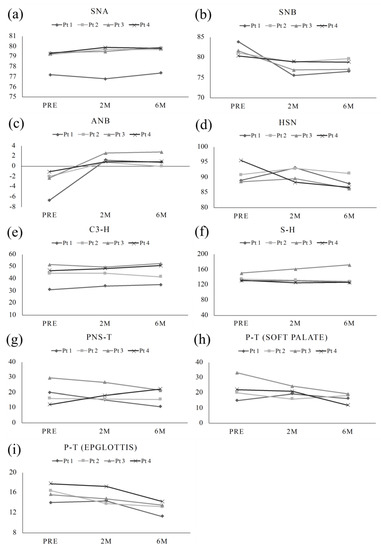 (a) SNA and (b) SNB show the position of the maxilla and mandible to the base of cranium over time, respectively. (c) ANB shows the transition of the anteroposterior position of the maxilla and mandible over time. (d) HSN, (e) S-H, (f) C3-H, and (g) PNS-T show the preoperative and postoperative hyoid and tongue position over time. And (h) P-T (soft palate) and (i) P-T (epiglottis) show the anteroposterior width of the pharyngeal region over time. As for maxilla and mandible, SNA did not change significantly preoperatively and postoperatively, while the SNB and ANB showed improvement postoperatively. The position of the hyoid bone and the anteroposterior diameter of the airway did not change significantly between preoperative and postoperative periods.