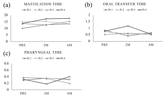 Transition of (a) mastication time, (b) oral transfer time, and (c) mastication time preoperatively, 2 months postoperatively and 6 months postoperatively. Mastication time showed a slight increase in the postoperative period, while oral transfer time and pharyngeal time showed no significant difference between the preoperative and postoperative periods.