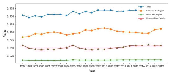 As shown in Figure 2, the development of China’s carbon emissions decoupling index is relatively stable. Between 1997 and 2019, the overall Gini coefficient of the country was between 0.146 and 0.181. Specifically, from 1997 to 2004, it was relatively stable and fluctuated slightly. By 2005, it had a relatively high rise. From 2005 to 2017, it had stable development. By 2018, it had a relatively high rise for the second time. In general, the change was small, and the overall difference of decoupling index was increasing.