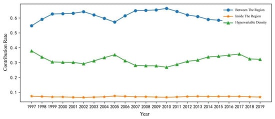 From Figure 4, we can find that the collinearity between regional differences and the carbon emissions decoupling index is the largest, ranging from 0.547 to 0.664. During the study period, the differences between regions fluctuated but generally showed an increasing trend. The contribution rate of hypervariable density takes second place, ranging from 0.269 to 0.379. The contribution rate has little change during the investigation period, showing a downward trend overall. The contribution rate of regional difference is the smallest, between 0.066 and 0.075, and the contribution rate is stable.