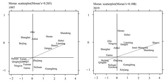 For space reasons, only the results of 1997 and 2019 are reported. It can be seen from Figure 5 and Figure 6 that the corresponding nodes of the industrial structure upgrading indicators and the Moran index of carbon emissions among regions are mainly distributed in the first and third quadrants; that is, the regions have a strong directional promotion effect in local space, which is consistent with the test conclusion of the global Moran index. From 1997 to 2019, the total number of regions falling between the first quadrant and the third quadrant increased, which shows that the positive correlation between the industrial structure upgrading index and carbon emissions in some regions has increased. Therefore, due to the apparent positive correlation characteristics of local space, the influence of spatial factors should be fully considered to optimize the measurement mode of space.