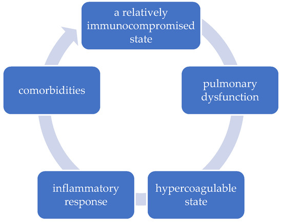 The main mechanism of action of SARS-CoV-2 is the binding of the virus to the ACE-2 receptor. In addition to the expression of ACE-2 in the epithelium of the respiratory tract, a crucial role is played by the coupling of ACE-2 expressed in vascular endothelial cells [23]. The pathophysiological triad is represented by stimulation of the renin-angiotensin system, decreased fibrinolytic activity, and increased platelet aggregation [18]. This is followed by an increase in the production of proinflammatory cytokines (interleukin-6) with an increase in vascular permeability, activation of coagulation pathways, stimulation of megakaryopoiesis, and stimulation of coagulation factors synthesis [24,25]. With the penetration of the virus into endothelial cells, both direct lesions and endothelial alterations appear, with proinflammatory thrombotic effects, by inhibiting fibrinolysis and stimulating thrombin production [22,26]. Neutrophil activation and platelet-neutrophil interrelationship lead to the appearance of immunothrombosis [3,27]. One hypothesis regarding antiplatelet therapy’s mechanism is the blockage of the positive feedback loop by decreasing the activation of neutrophils and coagulation factors, leading to a decrease in the immunothrombosis cascade [3,28].
