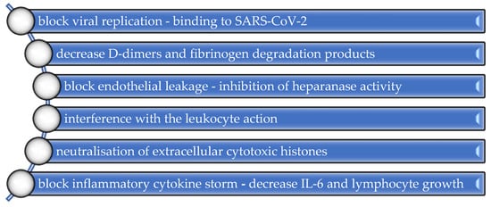 According to the ISTH recommendations on the treatment of coagulopathy in COVID-19, initiation of prophylactic anticoagulant therapy with LMWH should be performed as soon as possible to prevent extensive thrombosis [33]. The balance between the risk of thrombosis and the possible risk of bleeding is essential to evaluate the beneficial non-anticoagulant effects of high-dose LMWH [99,100,101] (Figure 2).