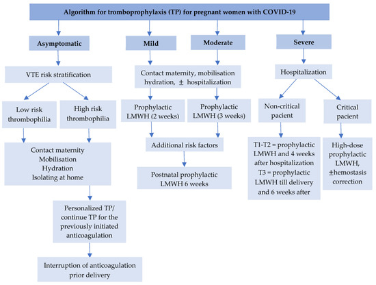 Algorithm for thromboprophylaxis for pregnant women with COVID-19. (T1, T2, T3—first, second, and third trimester, VTE—venous thrombembolism, LMWH—low molecular weight heparin).