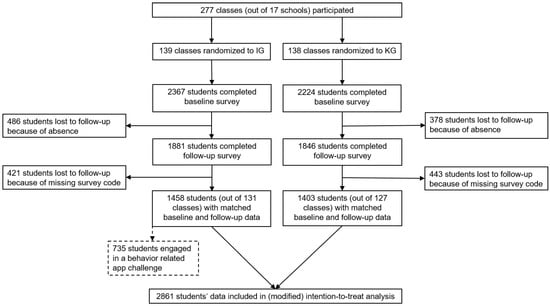 For descriptive baseline data, we used standard code to tabulate ratios for data on nominal and ordinal scale levels. Metric data are presented with means and standard deviations (SD). As part of the attrition analysis, linear regressions were applied to evaluate differences between students that completed the follow-up survey and students that dropped out of the study. Differences between groups for change of all dichotomous outcomes from baseline to follow-up were analyzed using multilevel logistic mixed-effects regression models to account for the clustered structure of the data, with clustering occurring within federal states, schools, and classes []. Fixed effects were group (IG vs. CG) and students’ highest education. Education was added as covariate as there were differences between the intervention and control groups at baseline. Random intercepts were added at federal state, school, and class level. Odds ratios, 95% confidence intervals, and p-values were calculated and are reported for all outcomes. Sensitivity analyses included 1) computing the models for all behaviors separately, using only the actual app-users of the respective challenge area, and b) an analysis with all individuals assessed at baseline. In this second analysis, missing data were imputed using the MICE technique (multivariate imputations by chained equations) with M = 100 imputations []. The pooling of the regression estimates followed Rubin’s rule []. All analyses were conducted with Stata 17.0 Standard Edition.