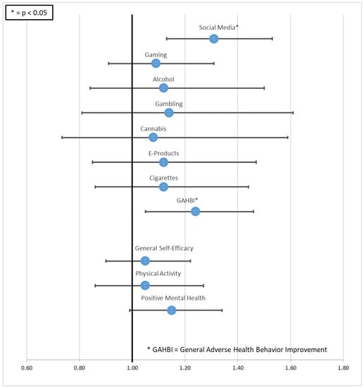 For the present analysis, we created dichotomous health-promoting change variables (yes/no = 1/0) for all outcomes. For alcohol, gambling, and cannabis, a health-promoting change was defined as a positive 30-day prevalence at baseline vs. a zero 30-day prevalence at follow-up. For the use of cigarettes and e-products, change was defined as a reduction of at least 50% in the monthly number of cigarettes or e-product units from baseline to follow-up []. For social media and gaming, change was defined as a reduction of daily screen time by at least 20 min []. As an additional primary outcome, we created a new variable called General Adverse Health Behavior Improvement (GAHBI). This variable was coded 1 (yes), if one of the variables described above was positive, meaning that there had been at least one health-promoting change in any of the areas. Likewise, for the secondary outcomes an elevated score at follow-up compared to baseline was coded 1, while a decrease or no change was coded 0.