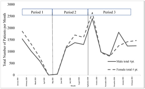 Trends in the numbers of patients seen between January 2020 and February 2021 distinguished by gender. Period 1: first strict lockdown; Period 2: reduction of restriction procedures; Period 3: second strict lockdown.