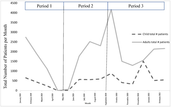 Trends in the number of patients served between January 2020 and February 2021. Period 1: first strict lockdown; Period 2: reduction of restriction procedures; Period 3: second strict lockdown.