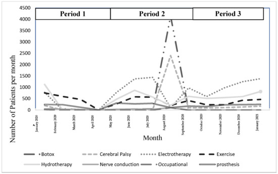 Figure 4 shows the types of services accessed during the three time periods. Almost the same trends were seen for patients accessing specific services. Exercises and prostheses were the two commonly provided services during period 1, the Botox and cerebral palsy clinics were visited the most during period 2, and, finally, electrotherapy and hydrotherapy services were commonly provided during period 3.